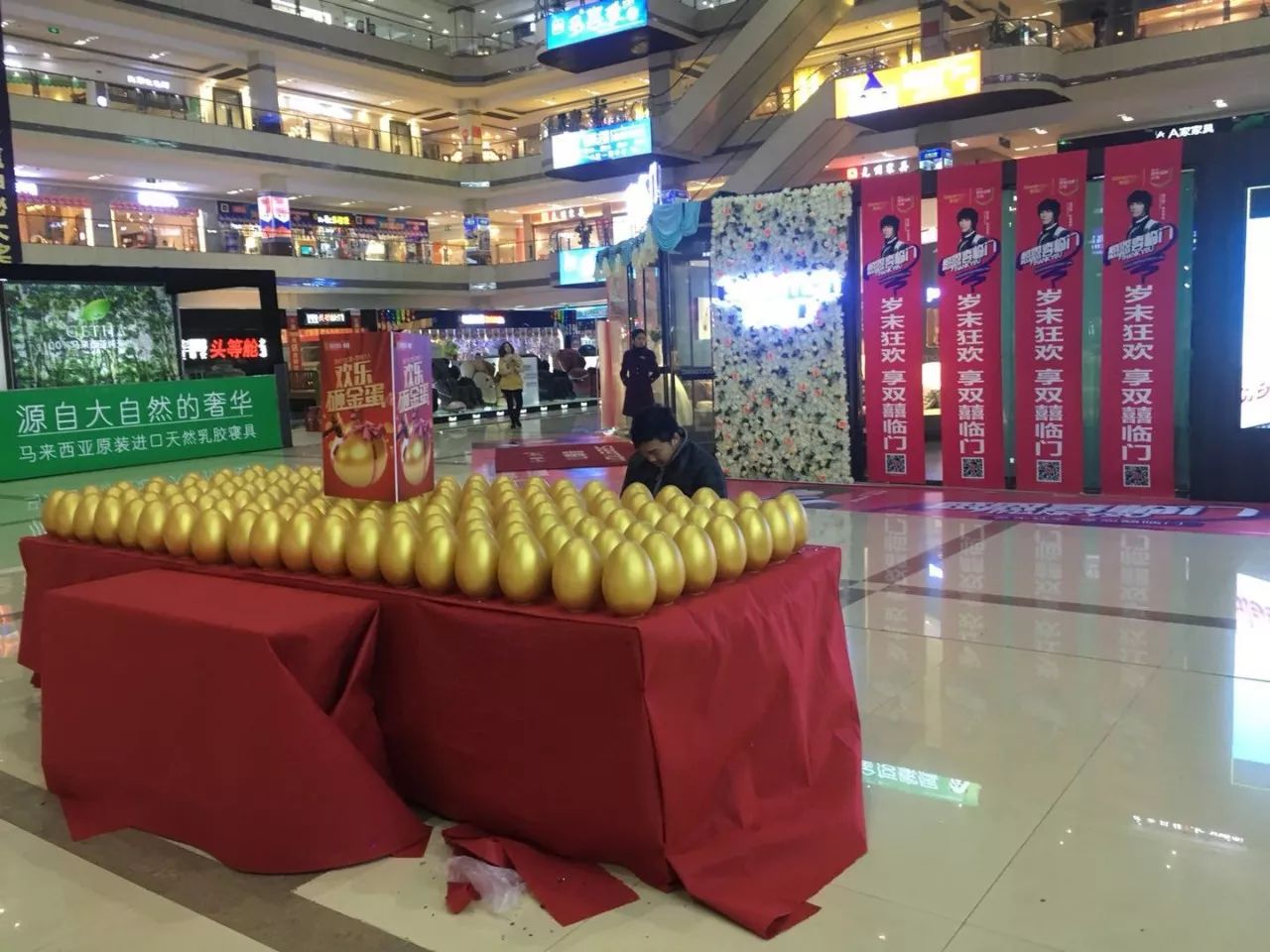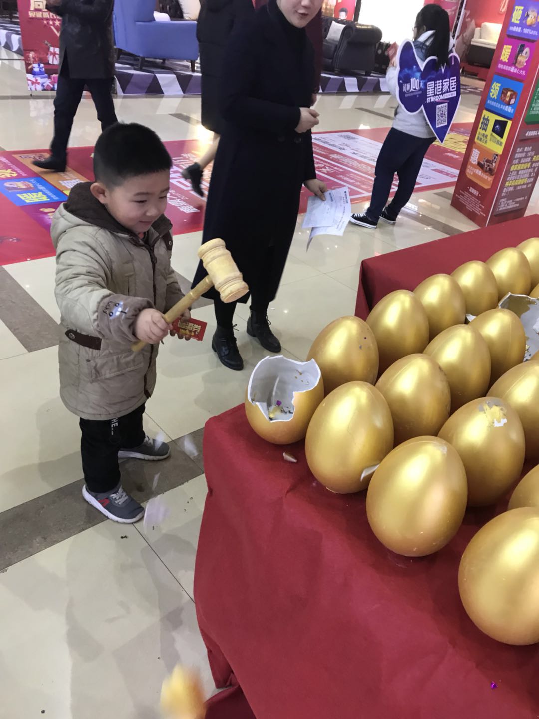 砸蛋现场满碎金纸碎金蛋壳,满桌已被主人领走的金蛋,足够证明活动现场的火爆,100%中奖的定律,使得现在每位消费者都得到了精美的礼品一份。